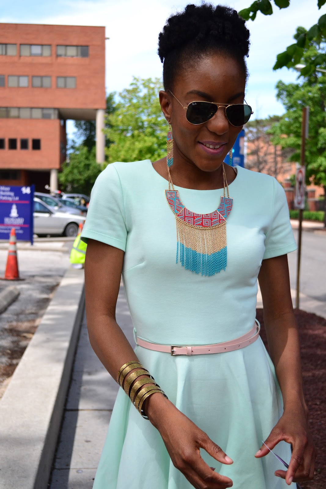As I was leaving graduation this weekend, my sister and I spotted a head-to-toe fashionista and luckily, she stopped her for a picture! We found out that her name is Selina and the beautiful necklace she is wearing is from her mother's own boutique (If you see this Selina, PLEASE send me the info to your mom's boutique so I can feature). Her shoes are from Zara and dress, I believe from H&M, and wow did she wear it well! The colors were beautiful and the outfit was not at all overdone. Perfect for a sunny day at a graduation and any events that she may have taken a part of after.